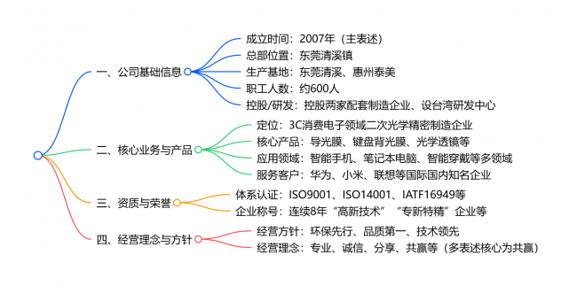 • 合作客户:国际国内知名企业,包括华为、小米、联想、vivo、OPPO、TCL、富士康、比亚迪、群光、华硕、索尼、飞利浦等 • 服务内容:为客户提供精密光学件的设计开发、精密制造与全球交付服务 三、资质认证与荣誉称号